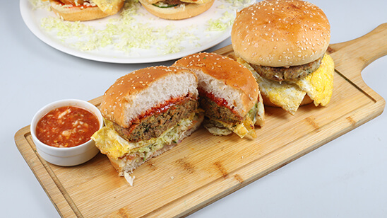 A perfectly spiced, tender shami kebab paired with a fresh fried egg, tucked inside a soft bun and topped with crisp lettuce, juicy tomatoes, and our signature sauces.