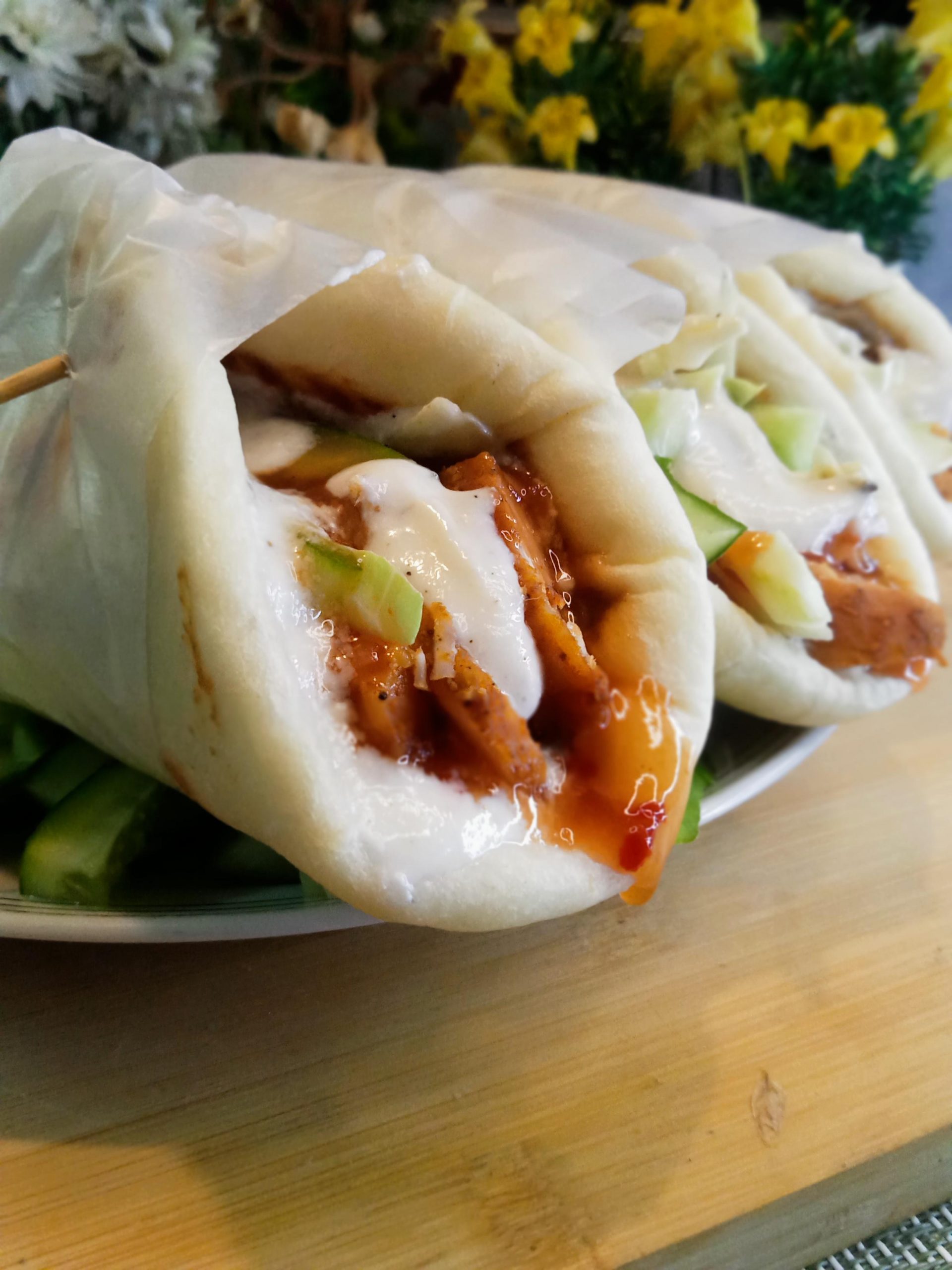 Seasoned, sliced chicken, wrapped in warm flatbread, alongside fresh vegetables like lettuce, tomato, onion and special sauce.